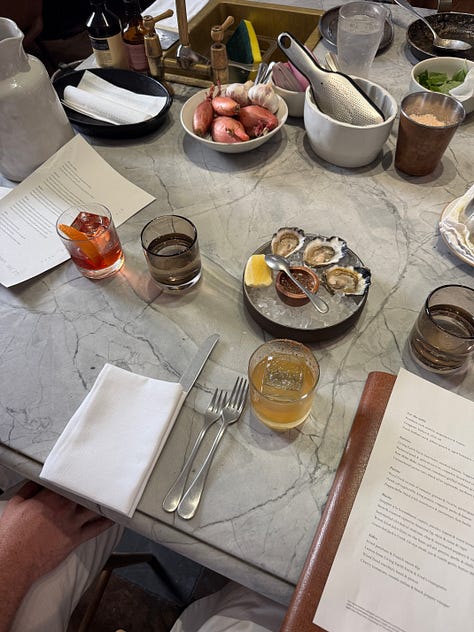 Sitting at the chefs table for lunch at Freds in Paddington - enjoyed a spicy margarita, oysters, fougasse, snapper, zucchini, tagliatelle, potatoes w/ french onion dip (!!) and a bottle of chablis